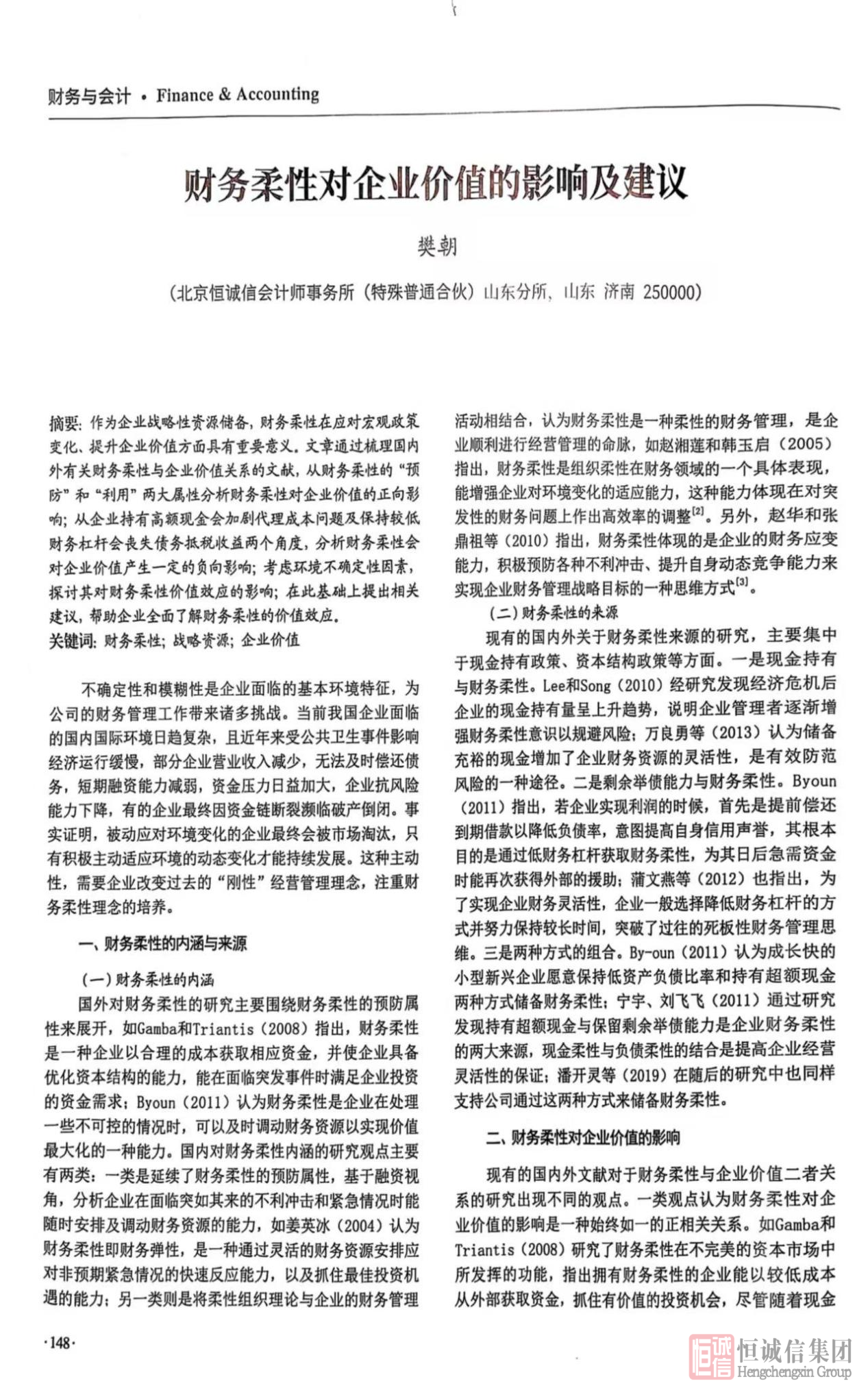 近日,北京恒誠(chéng)信會(huì)計(jì)師事務(wù)所(特殊普通合伙)山東分所樊朝撰寫的學(xué)術(shù)論文《財(cái)務(wù)柔性對(duì)企業(yè)價(jià)值的影響及建議》,在省級(jí)期刊《知識(shí)經(jīng)濟(jì)》的 “財(cái)務(wù)與會(huì)計(jì)” 板塊成功發(fā)表。這一成果不僅是樊朝個(gè)人學(xué)術(shù)研究能力的體現(xiàn),更是恒誠(chéng)信會(huì)計(jì)師事務(wù)所重視專業(yè)人才培養(yǎng)、推動(dòng)學(xué)術(shù)研究與知識(shí)創(chuàng)新的有力見證。