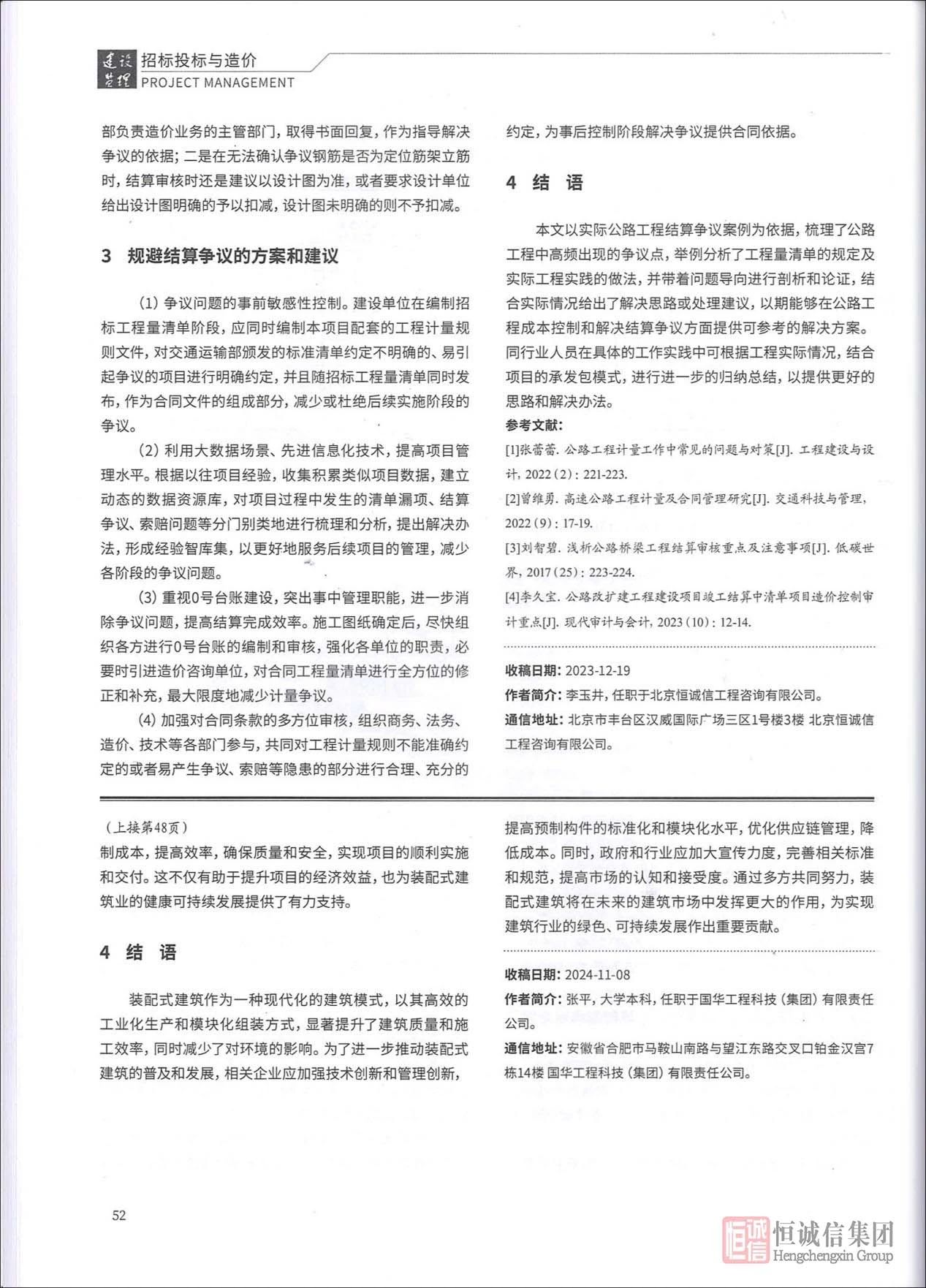 近日,恒誠(chéng)信集團(tuán)技術(shù)部總經(jīng)理李玉井的學(xué)術(shù)成果《公路工程結(jié)算爭(zhēng)議問(wèn)題分析及解決方案探討》在工程建設(shè)領(lǐng)域核心期刊《建設(shè)監(jiān)理》(Project Management)2025年第3期"招標(biāo)投標(biāo)與造價(jià)"專欄正式刊發(fā)。