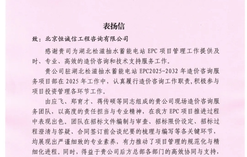 近日,北京恒誠(chéng)信工程咨詢有限公司以過(guò)硬的專(zhuān)業(yè)實(shí)力與優(yōu)質(zhì)的服務(wù)水準(zhǔn)獲國(guó)能龍?jiān)措娏夹g(shù)工程有限責(zé)任公司的高度認(rèn)可與表?yè)P(yáng)。在湖北松滋抽水蓄能電站項(xiàng)目中,能源事業(yè)部駐場(chǎng)造價(jià)咨詢團(tuán)隊(duì)以高度的責(zé)任擔(dān)當(dāng)與專(zhuān)業(yè)精...